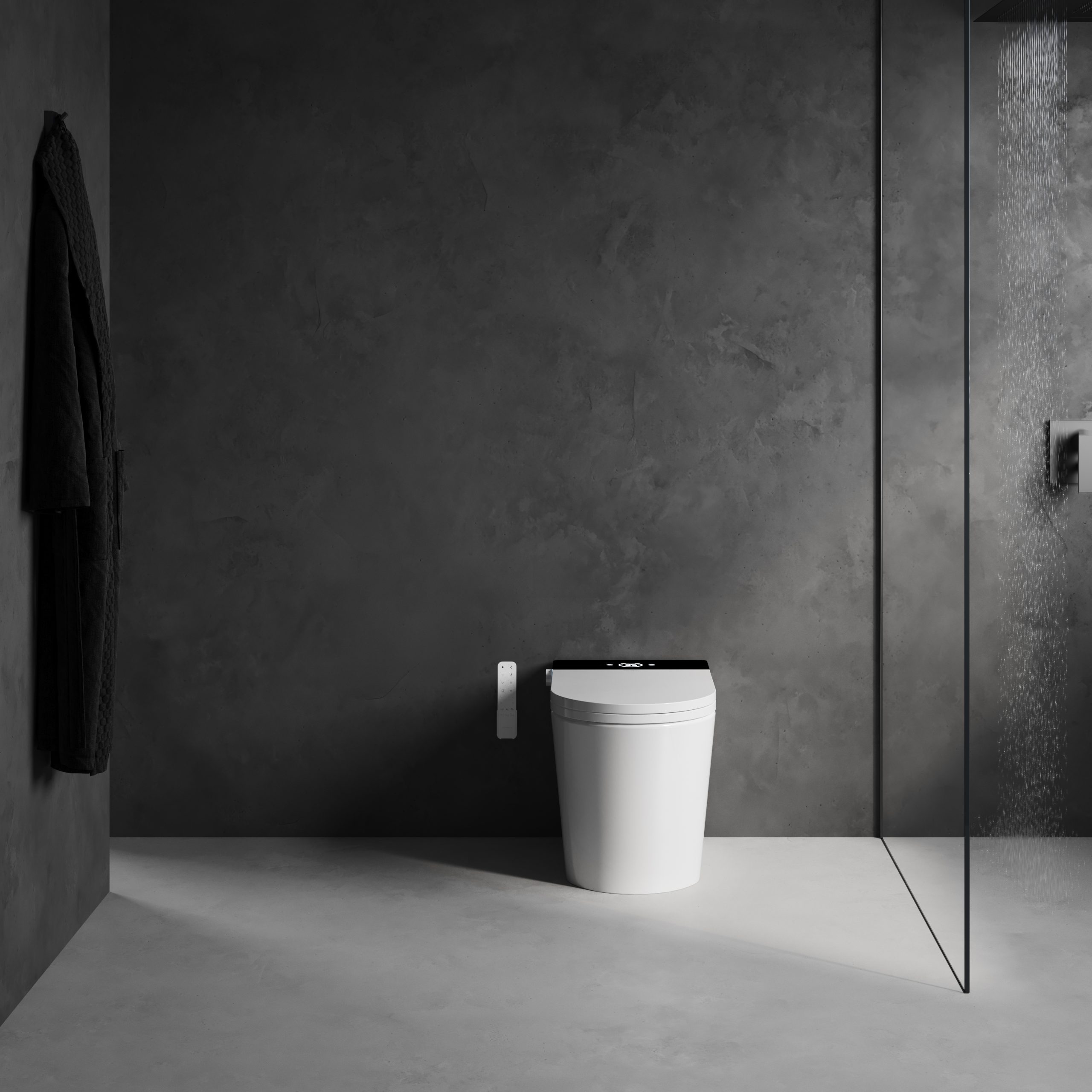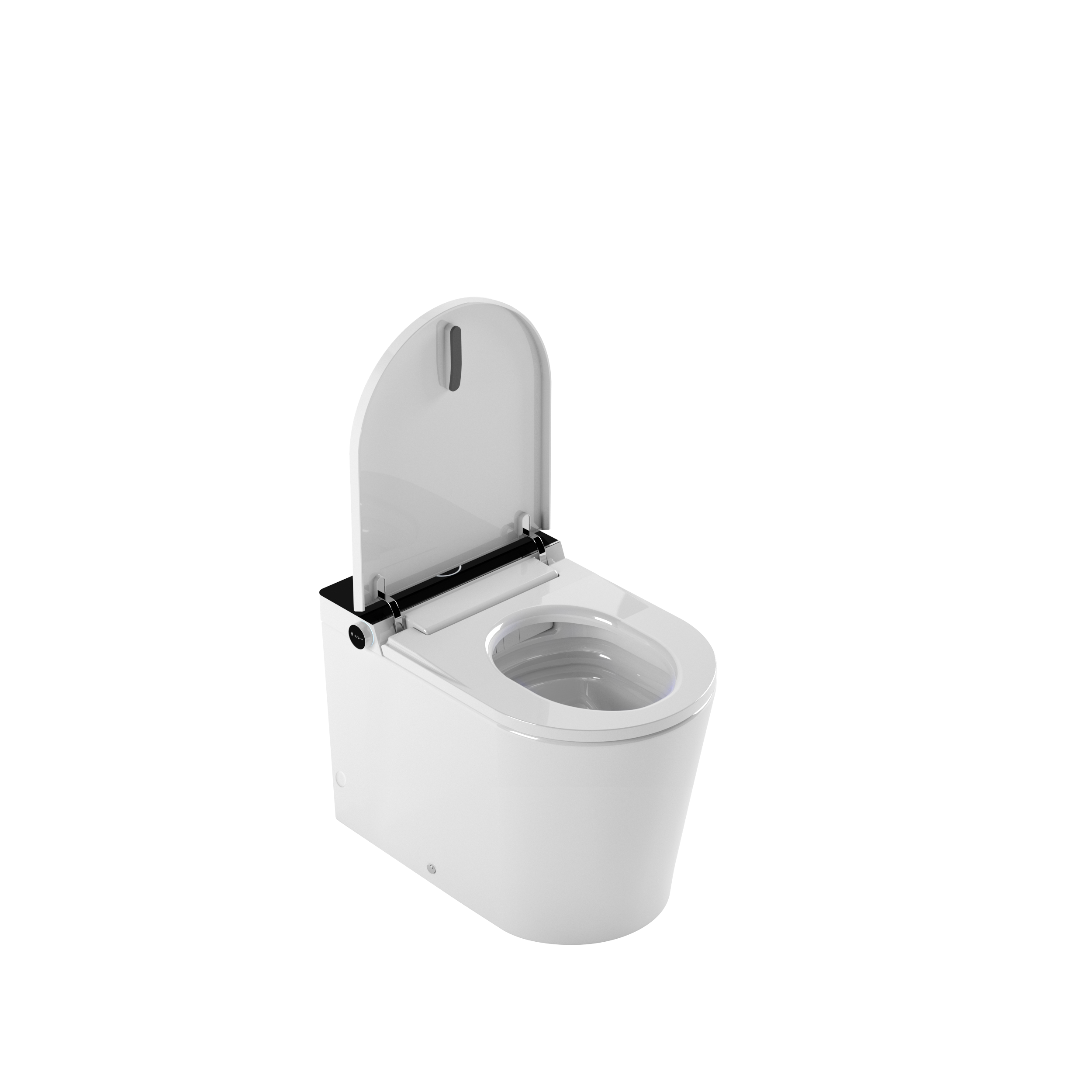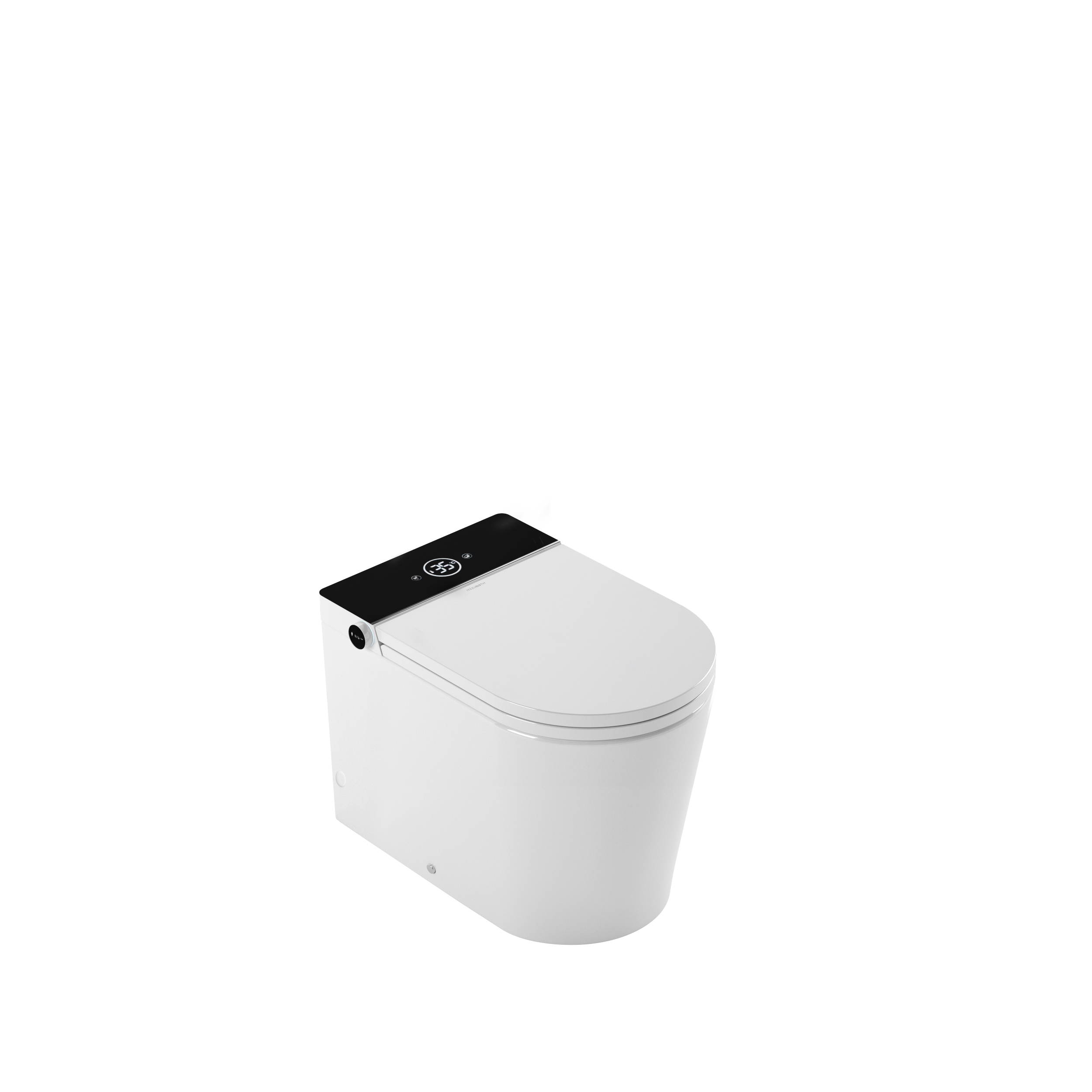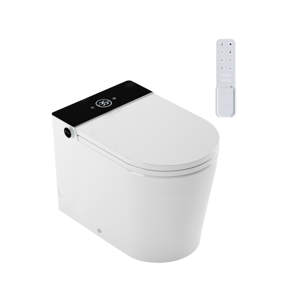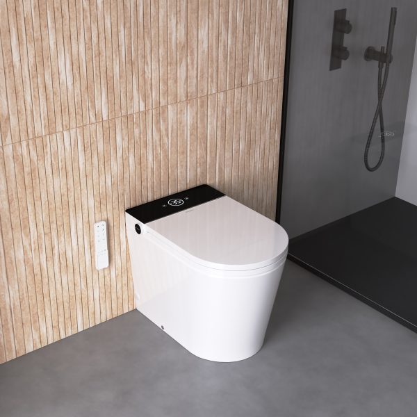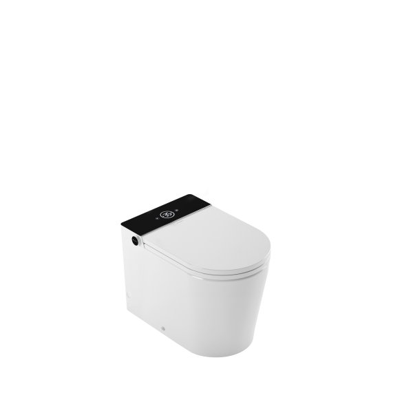 Inodoro a suelo con display negro que incluye cisterna incorporada dentro de la cerámica, ofreciendo una combinación perfecta de funcionalidad en mínimo espacio.